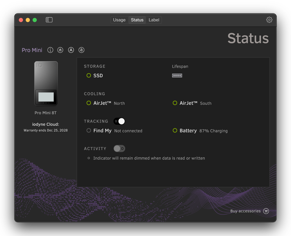 The Pro Mini battery automatically and intelligently charges when connected to a computer or camera, and powers Find My tracking while it is not connected. View the current charge level of the battery from the iodyne Utility Status view or Find My phone app.