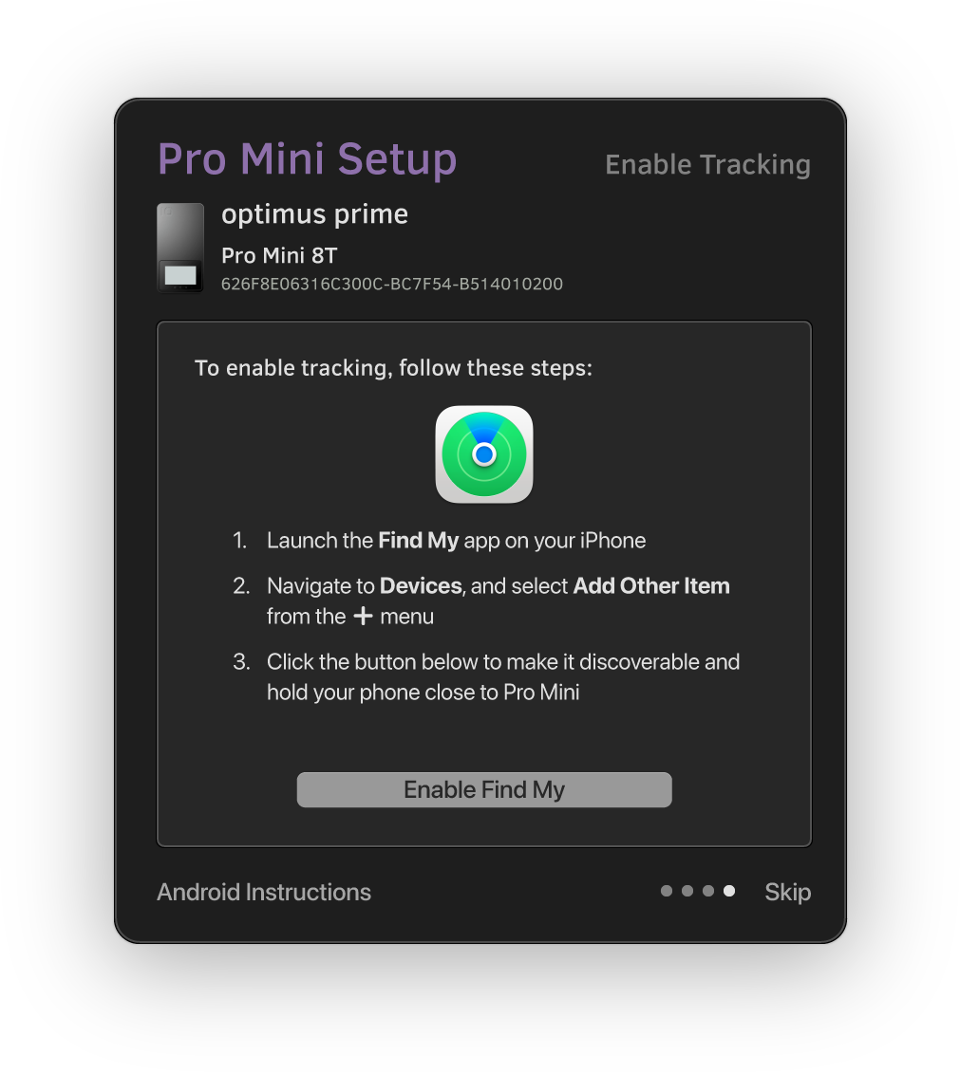 Launch iodyne Utility and complete the setup process. You will be prompted to enable Find My at the end of the process by following instructions for either iOS or Android: