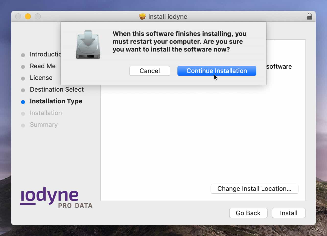macOS 10.15 Catalina only: Click Continue Installation to acknowledge that a system restart is required after software installation.