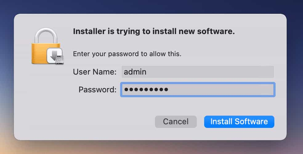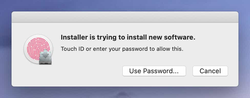 Enter an Admin password or use Touch ID to authenticate when prompted, then click Continue. Proceed through all the installation steps.