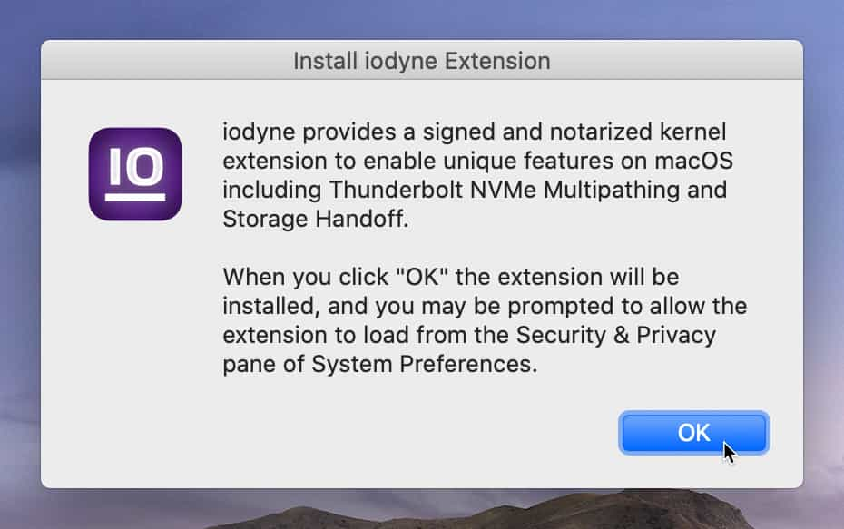 iodyne provides a system extension to enable features on macOS including Thunderbolt NVMe Multipathing and Storage Handoff.