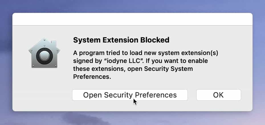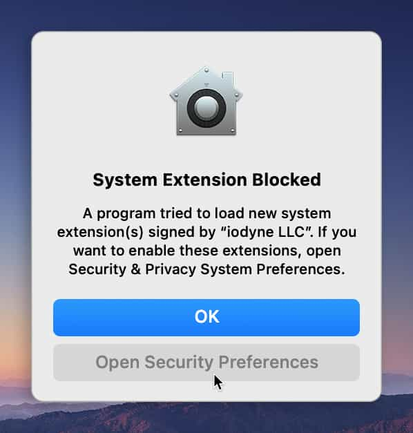 Upon installation, macOS may notify you that a System Extension has been blocked from loading. Open Security & Privacy Preferences by clicking Open Security Preferences when prompted, or from the Apple menu if not prompted, to permit installation to complete.