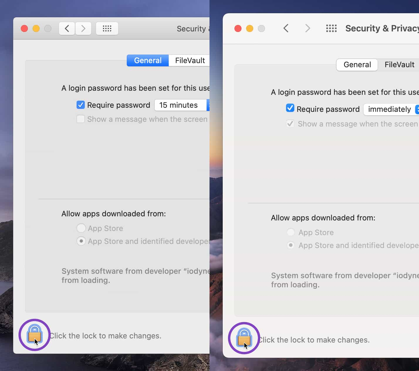 macOS 10.15 Catalina (L) and 11 Big Sur (R) Security & Privacy preferences -