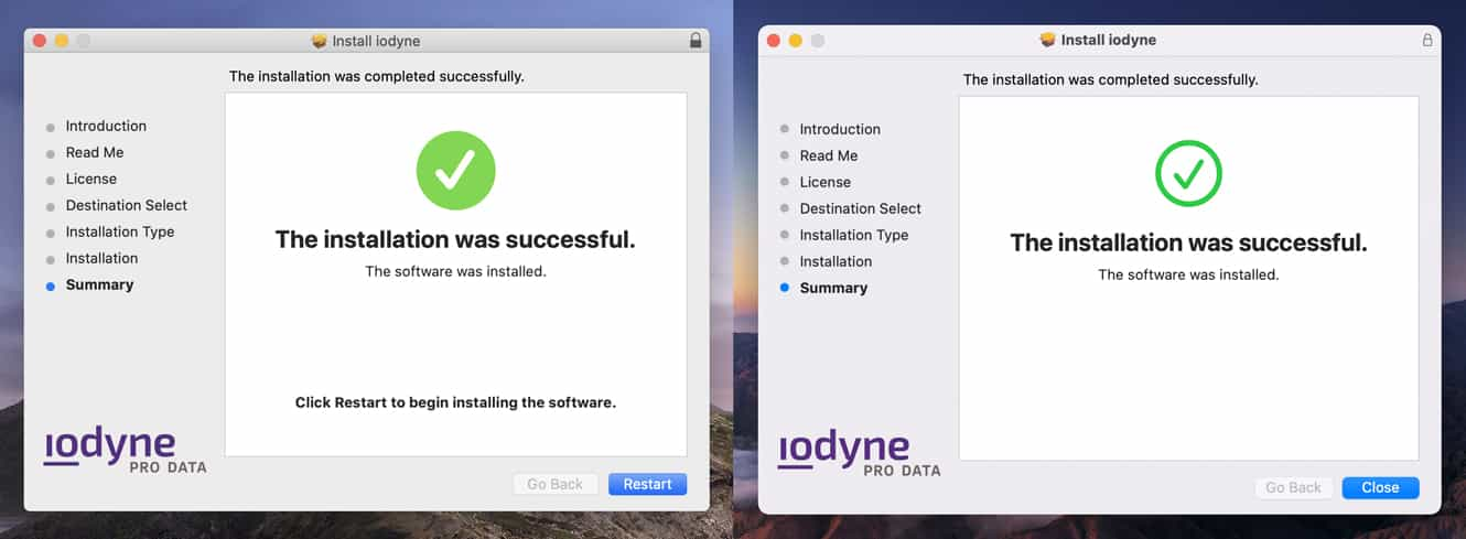 Once the system extension is allowed, iodyne Install will complete its tasks, showing the screens below. macOS 11 will prompt you to restart your Mac to load the system extension in a dialog, while macOS 10.15 prompts the user to restart from the installer app. Confirm that installation is complete, and restart your Mac from these prompts.