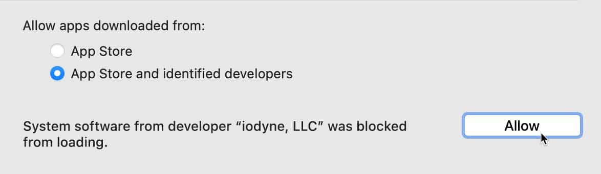 Look for the notification in the lower half of the unlocked window that reads “System software from developer ‘iodyne, LLC’ was blocked from loading.” Click the adjacent Allow button to permit the system extension to load. Note: The Allow button will disappear automatically if not acknowledged within 30 minutes. If this notification is not present, restart your Mac, and return to the previous step.