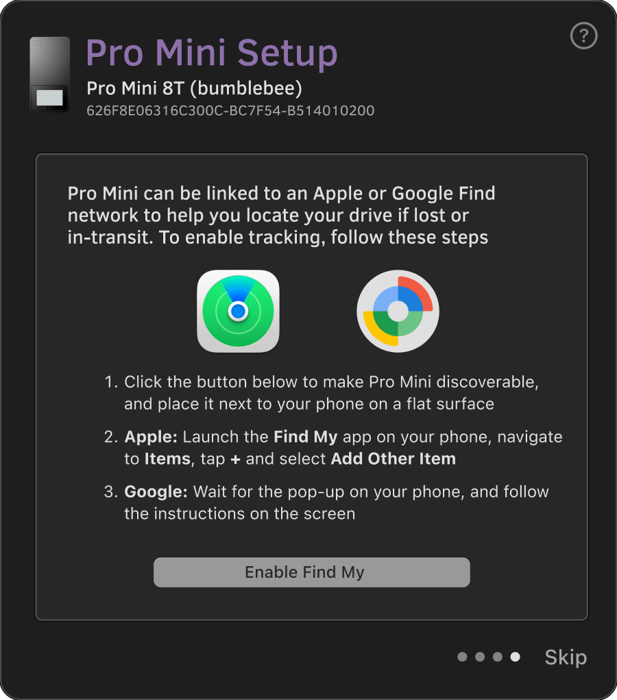 If you choose to skip this step during initialization, you can alternatively make Pro Mini discoverable by toggling Tracking on in the iodyne.app Status tab or selecting Enable Find My from the Devices menu.